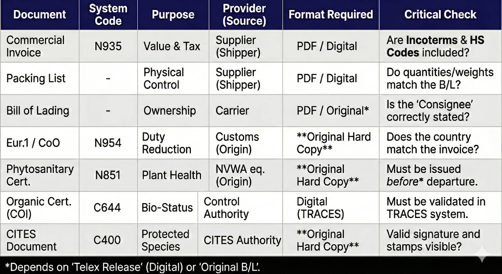 - Phytosanitary Certificate (N851): Mandatory for most fresh produce. Proves the shipment is pest-free.